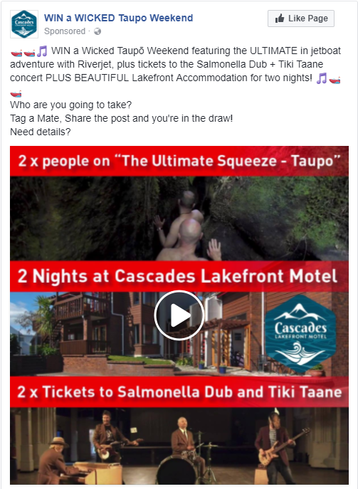 5. This competition runs from 8th December 2017 to the 11th January 2018 and is being promoted through various channels for both Cascades Lakefront Motel and NZ Riverjet.