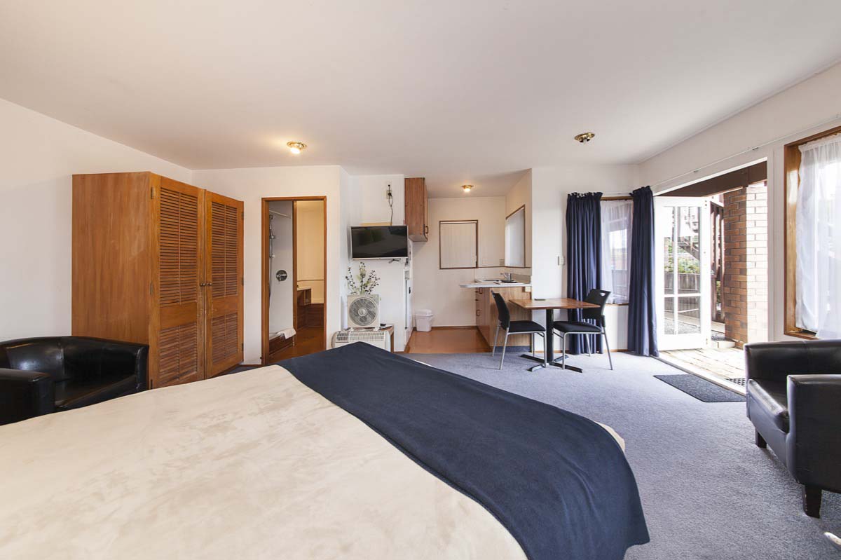Our upstairs Studio units are sunny, spacious, and quiet and open onto a shared balcony where you can relax and enjoy the view across Kaiwaka Point bay and over the lake.