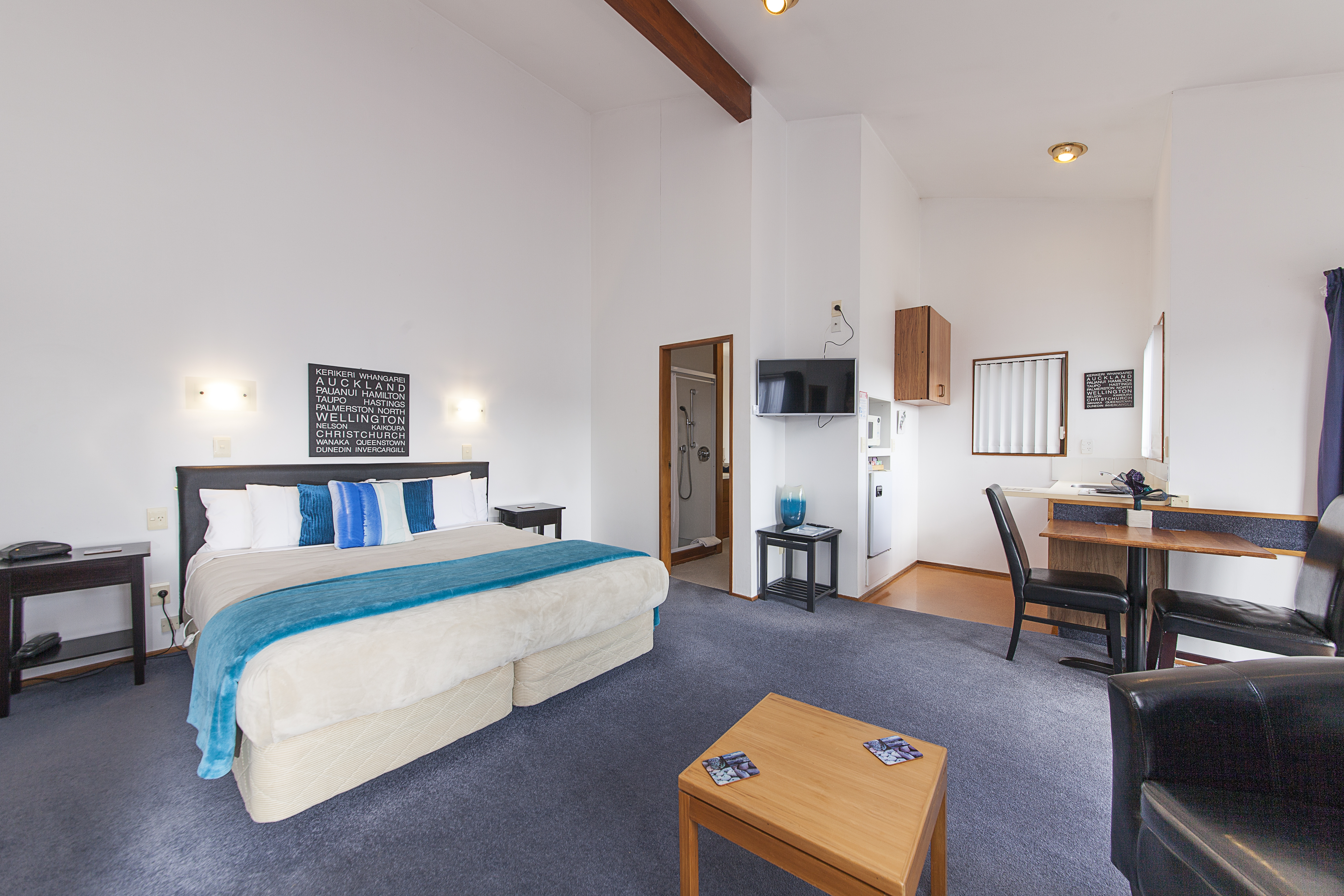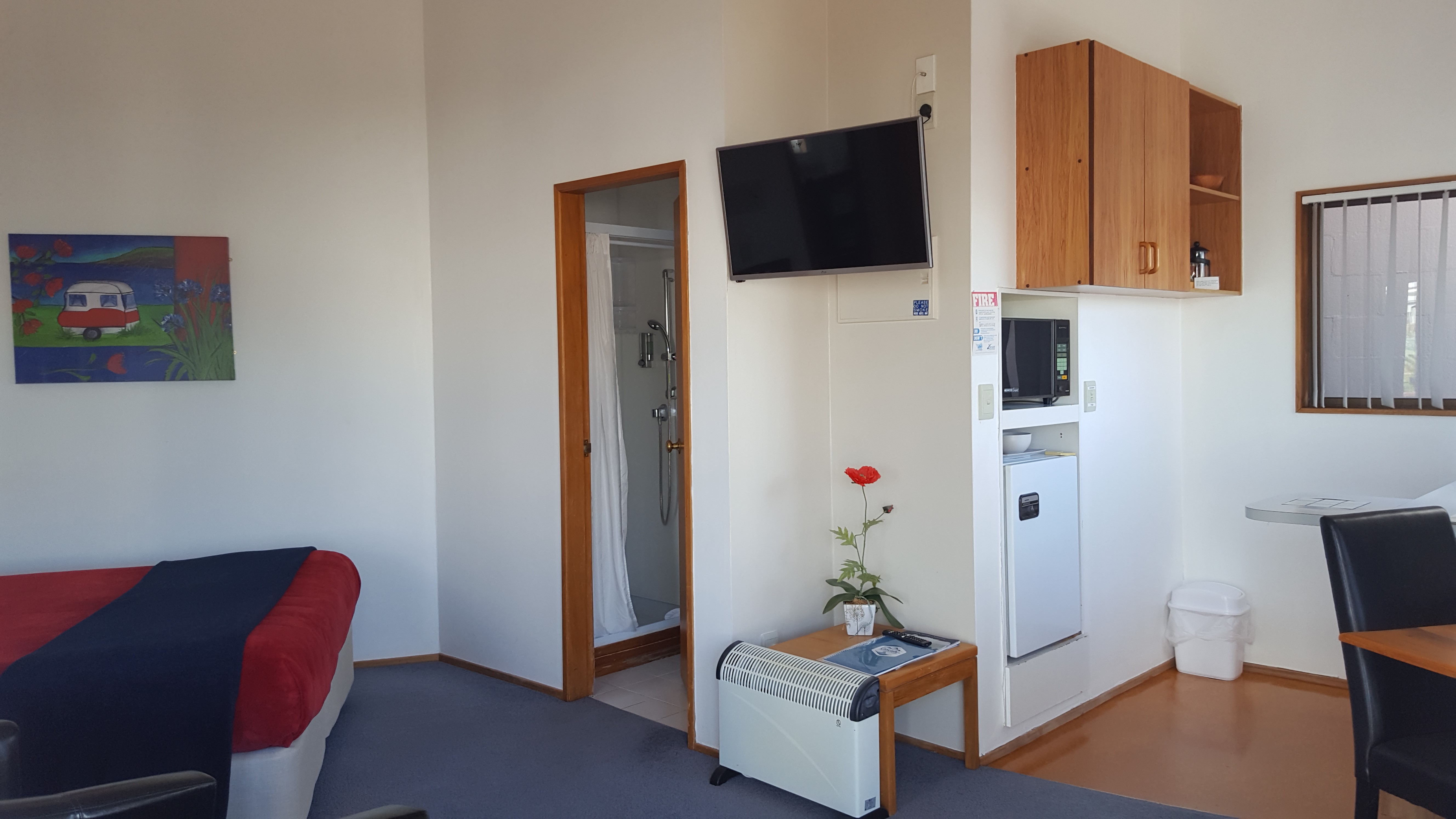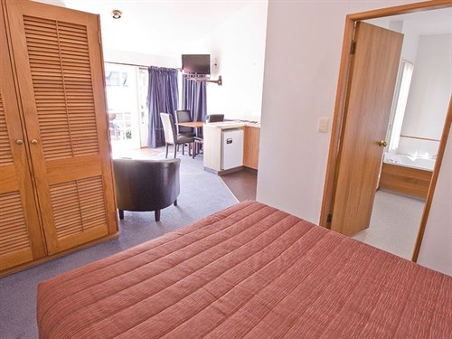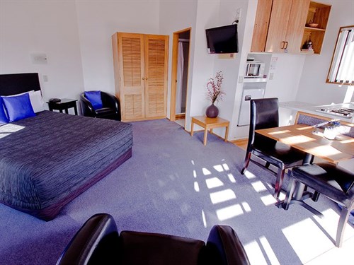Our upstairs Studio units are sunny, spacious, and quiet and open onto a shared balcony where you can relax and enjoy the view across Kaiwaka Point bay and over the lake.